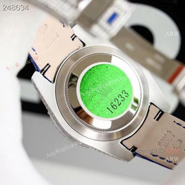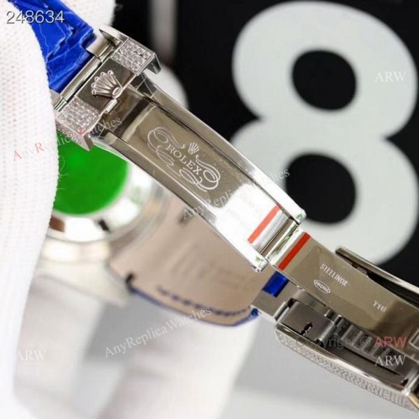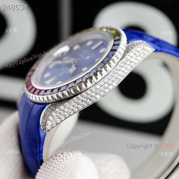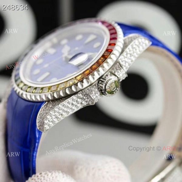 904L Stainless Steel case / rainbow diamond bezel / Blue Dial / Blue Leather Strap with diamonds clasp Rolex Submariner Replica Watch Buy Online
