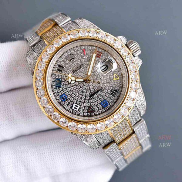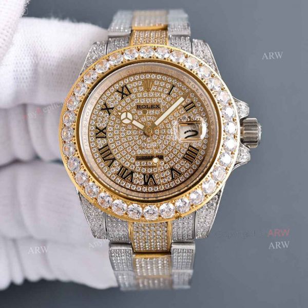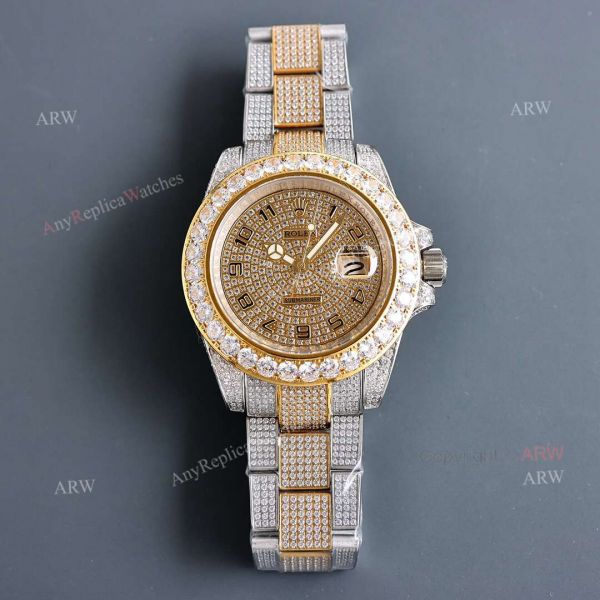 Luxury replica Rolex Submariner iced out diamond two tone gold watches are for sale now.