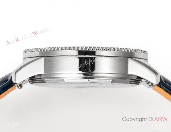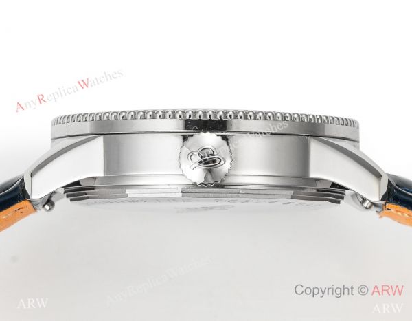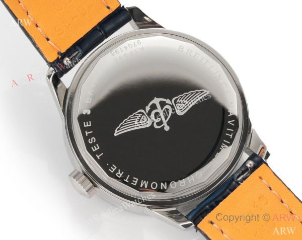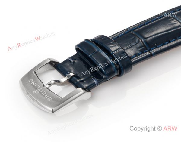 Watchband: Blue Leather strap with pin buckle, Breitling logo on it