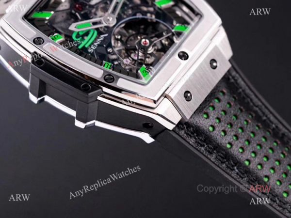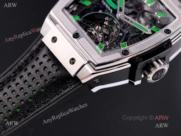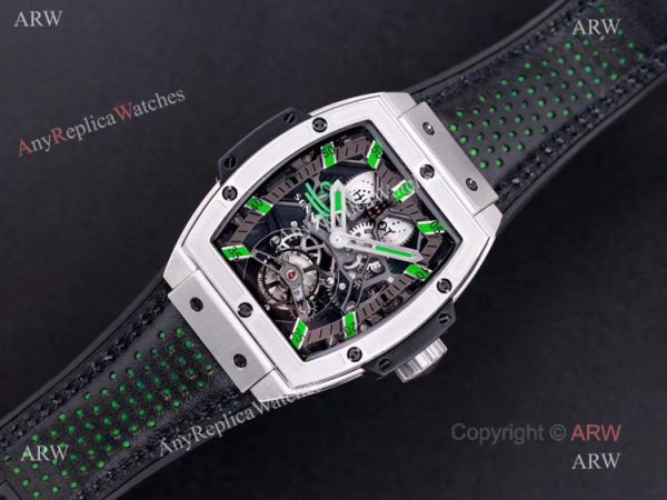 Stainless Steel Watch Case - Hublot Skeleton Dial - Hublot Black Rubber Strap wtih Green Deco