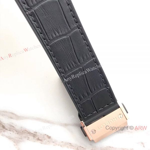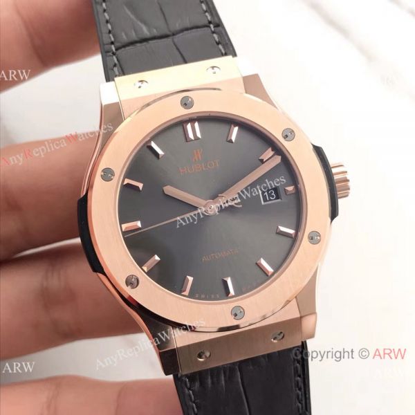 Rose Gold Coated Stainless Steel Watch Case Grey Rhodium Dial Gray Gummy Strap Hublot Classic Fusion Rose Gold