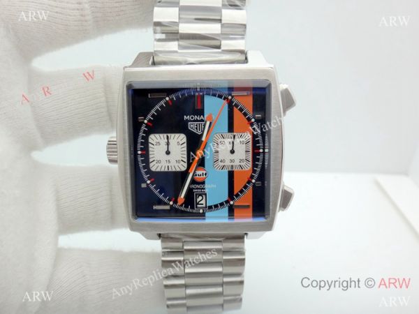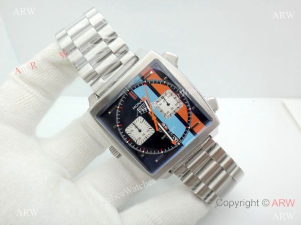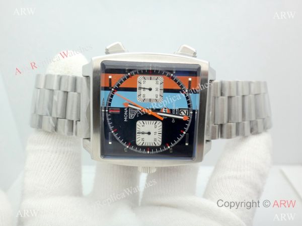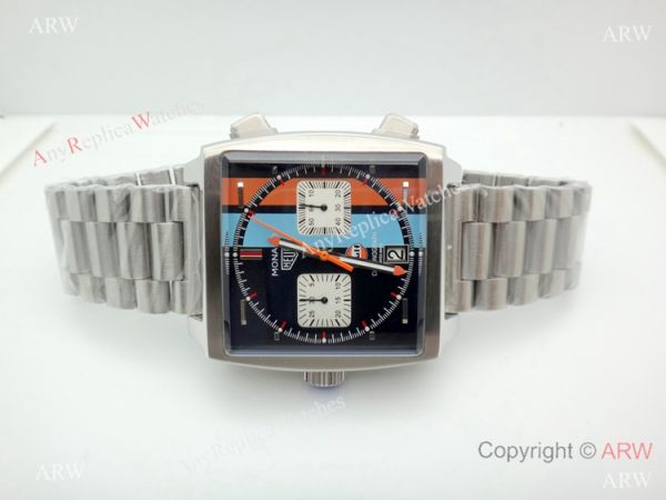316L Stainless Steel Watch Case Orange and Blue Face Tag Heuer Monaco Quartz Watch