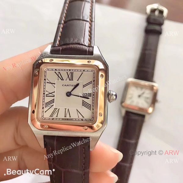 Two Tone Rose Gold Case White Dial Black Leather Strap Cartier Mens Dumont Watch