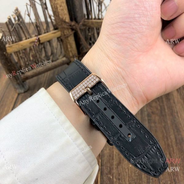 Rose Gold Diamond Case Black Gummy Strap Black Dial