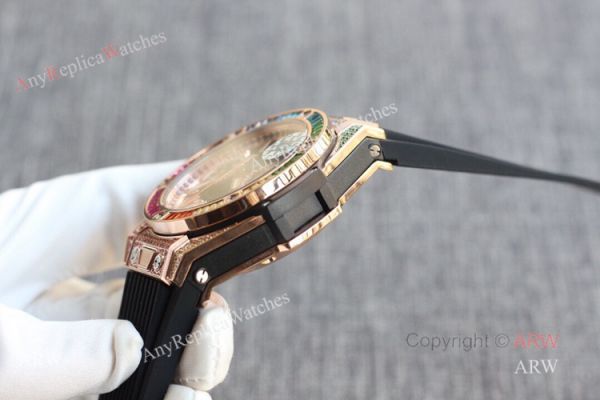 Rose Gold Rainbow Diamond Watch Case - Hublot Black Skeleton Dial with Rainbow Diamond Arabic Numers - Hublot Black Rubber Strap