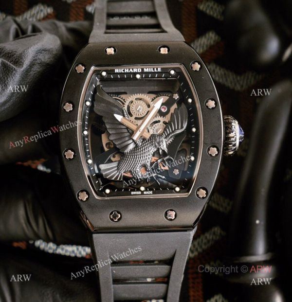 Case: Richard Mille Black Ceramic Watch Case, which provides a striking contrast and visual depth, against which the Eagle.