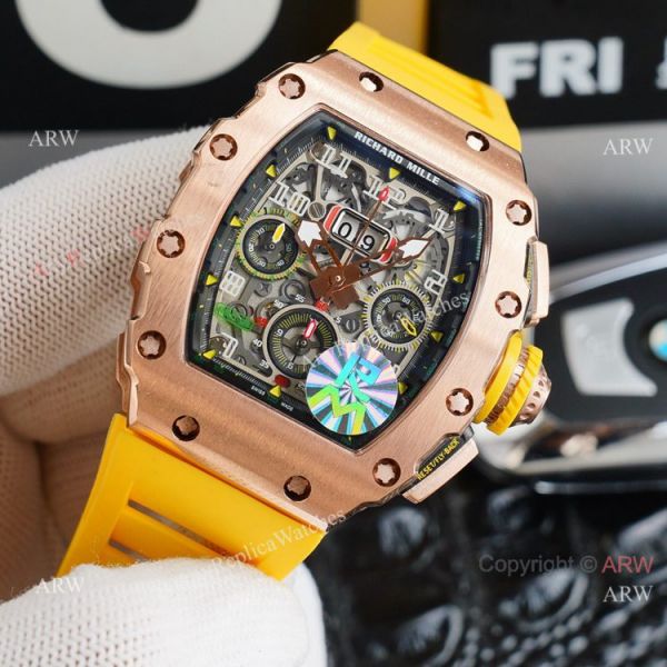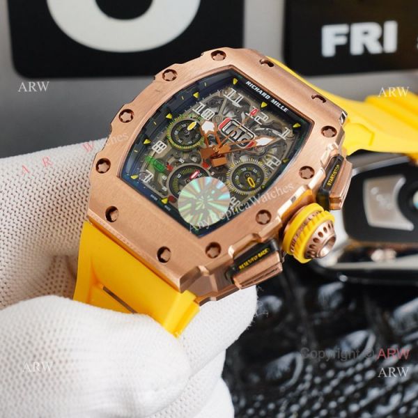 Rose gold case and bezel - Richard Mille Skeleton Dial - Richard Mille Yellow Rubber Watch Band Richard Mille Watch Replica AAA Quality