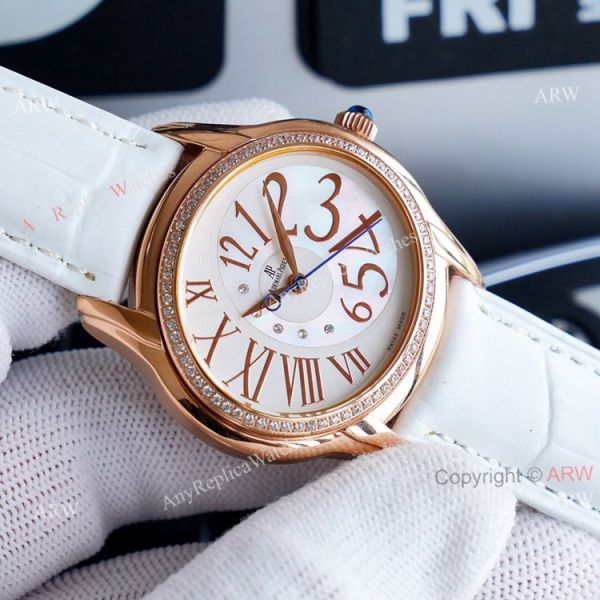 Stainless steel and rose gold plated watch Case - AP white mother of pearl dial - Rose Gold Diamond Bezel - AP White Leather strap for this Audemars Piguet Watch