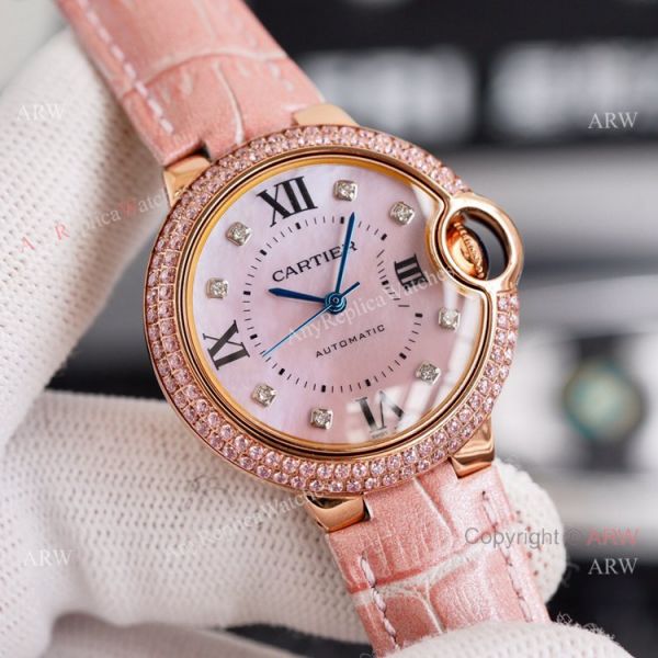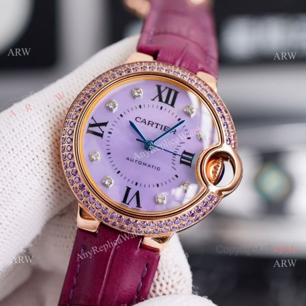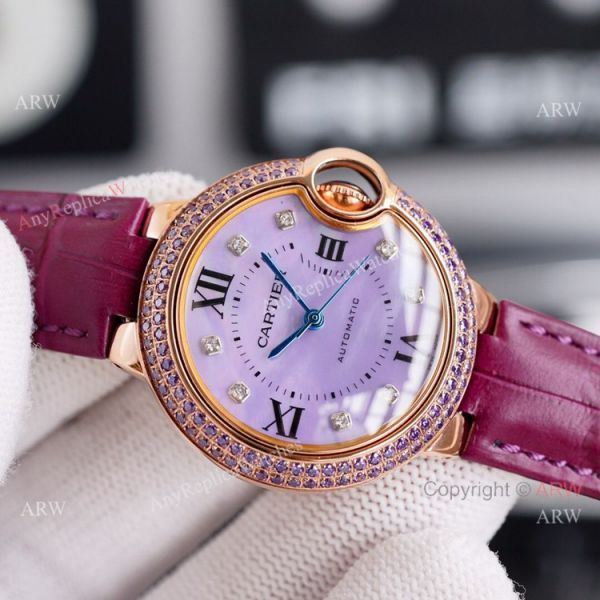 Ladies Cartier Ballon Bleu 33mm Rose Gold diamond Purple Dial Purple Leather Strap Replica Watches