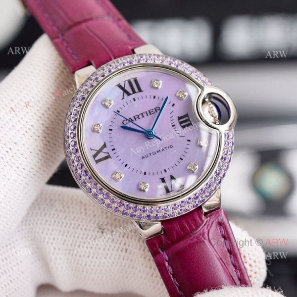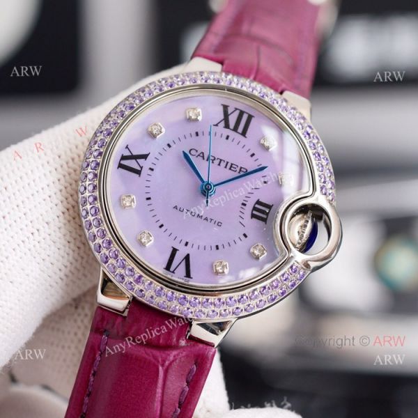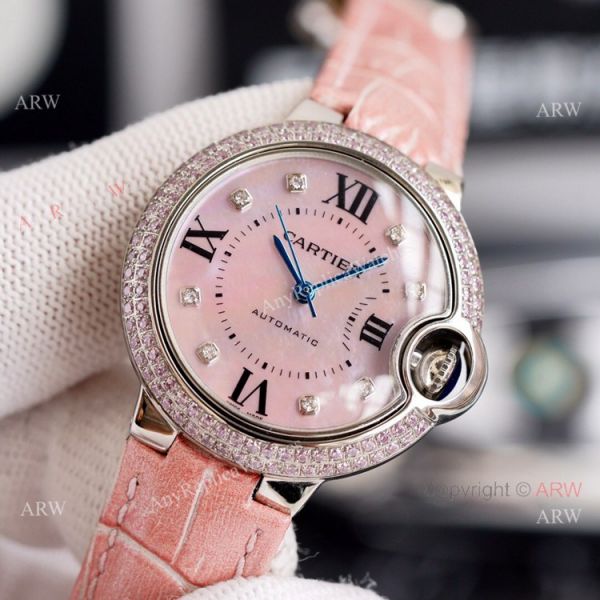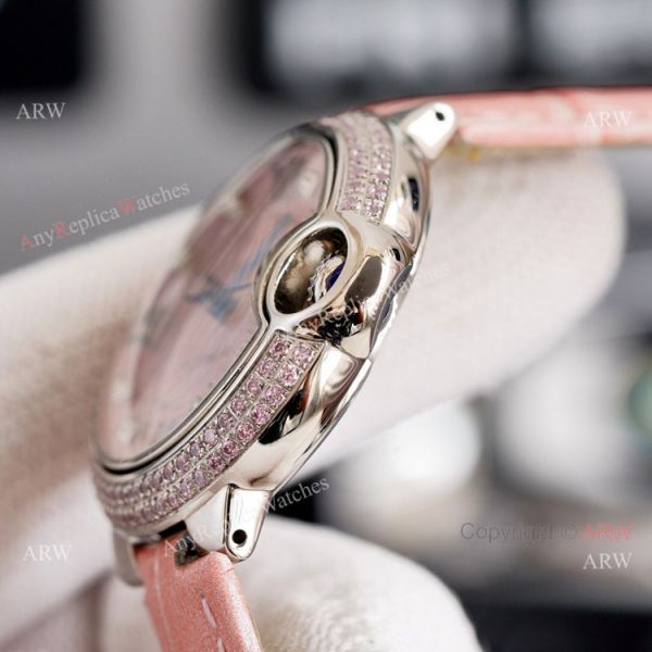 Cartier Ballon Bleu 33mm With Diamonds Bezel Pink MOP Dial Pink Leather Strap Copy Watch