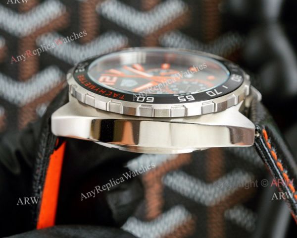 316L Steel Case - Black Leather Strap with orange stitch - Black Unidirectional Bezel - Black Dial with orange markers TAG Heuer Knockoff Watch