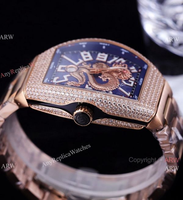316L Rose Gold Iced Out Case Rose Gold Strap Blue face w/ Dragon King Franck Muller Yachting watch