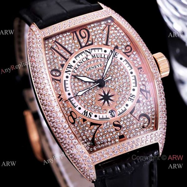 316L Stainless steel Iced Out Case Iced Out Diamond face with Arabic numbers Black Leather strap Iced Out Franck Muller Watch