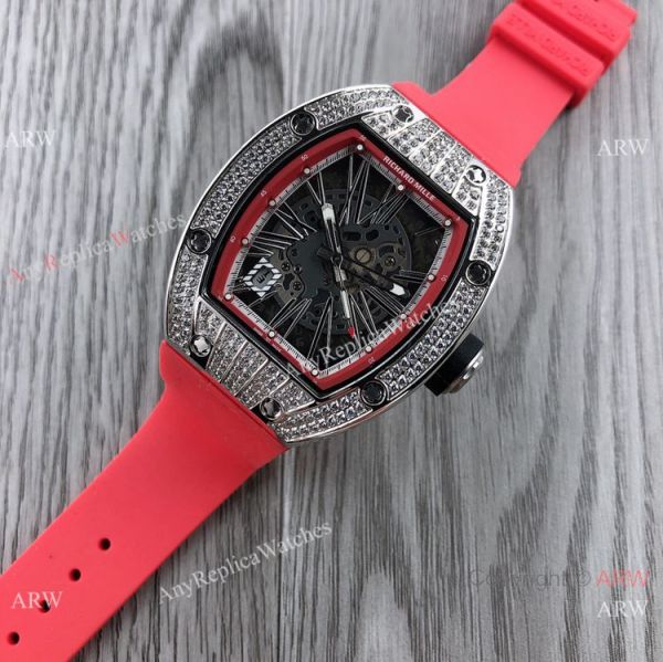 Rose Gold coated 316L Stainless Steel Case Inlaid with Diamonds Skeleton Dial Red Rubber Bracelet