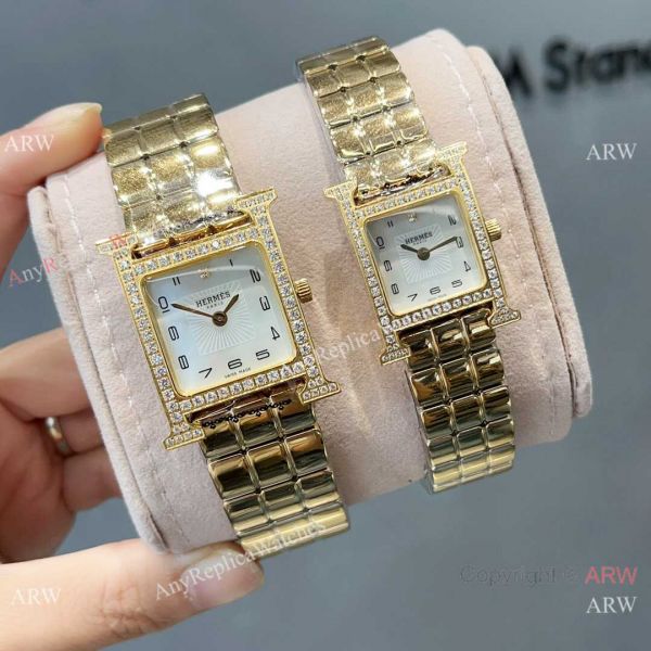Replica Hermes Heure H Yellow Gold Diamond-set Watches Sapphire Glass