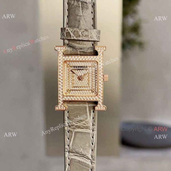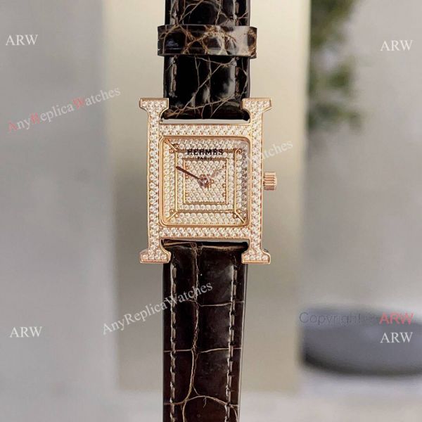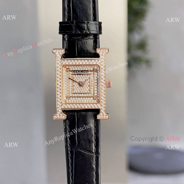 Stylish Hermes Heure H Rose Gold Pave Diamond Watches 21mm Ladies