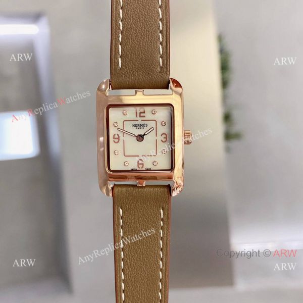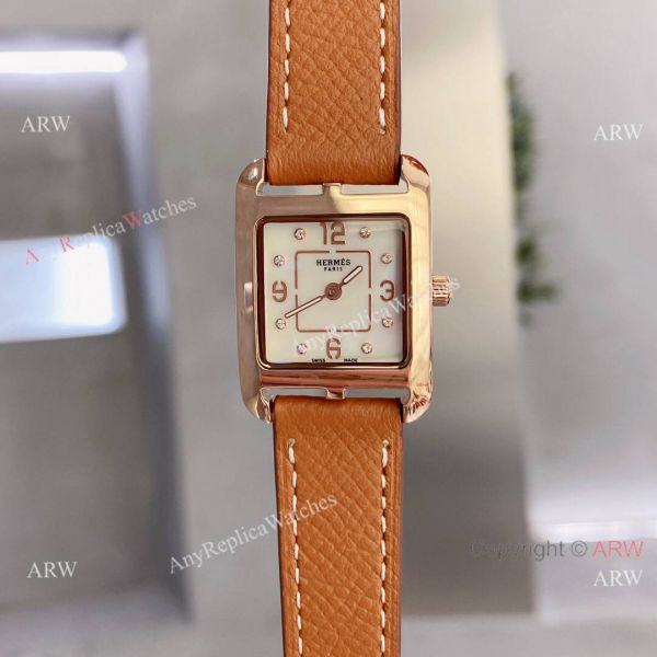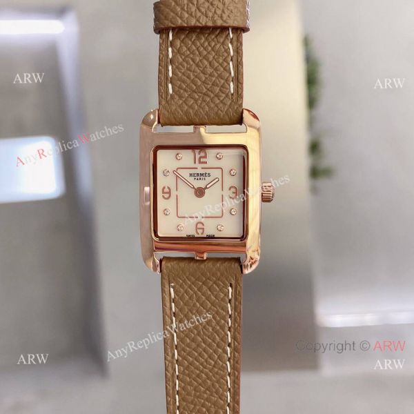 Swiss Quartz Hermes Cape Cod Copy Watches Rose Gold Tan leather strap