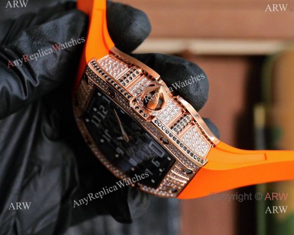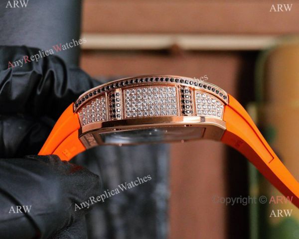 Rose Gold coated 316L Stainless Steel Case Inlaid with Diamonds Skeleton Dial Orange Rubber Bracelet