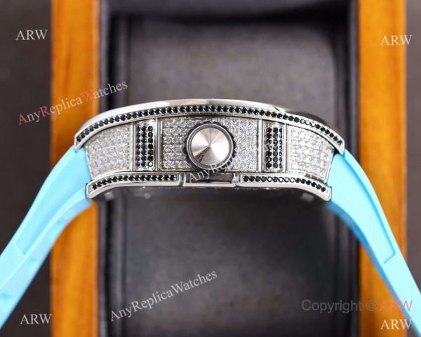 Iced Out Stainless Steel Case Skeleton Dial Sky Blue Rubber Bracelet