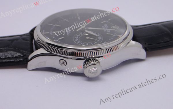 Stainless Steel Polished Finish Case Black Face With Black Leather Strap, Date Operate At 3 O'Clock Sub-Dial.