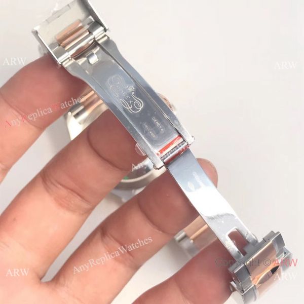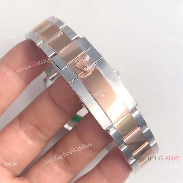 Watch Band: Swiss Grade Tow Tone Rose Gold plated 904L Steel Rolex watch bracelet with hidden clasp displaying the Rolex logo.easy adjustable screw links.